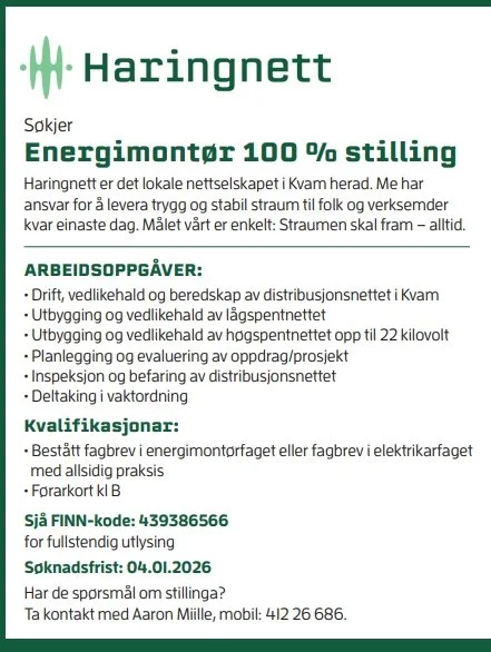 Styret i Kvam Energi har vedteke å endre namn på nettselskapet Kvam Energi Nett AS. Det nye namnet er Haringnett AS.